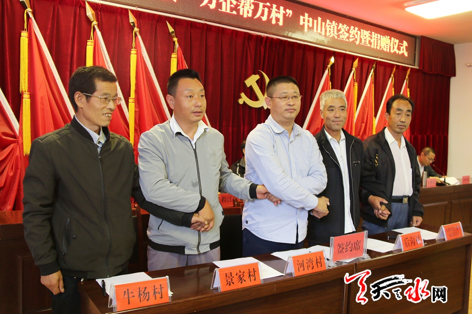 当日,杨青松一行来到秦安县深度贫困镇中山镇就东西部扶贫协作工作进行调研,并在秦安县中山镇举行“万企帮万村”签约暨捐赠活动,天津市3家企业分别与秦安县中山镇10个深度贫困村签订了“万企帮万村”协议书,同时捐赠了一批电动农药打药机。签约和捐赠活动结束后,天津市帮扶工作组全体成员分五组分头深入贫困村开展贫困户结对认亲活动。其中部分企业还深入到麦积区,与麦积区相关农业产业化龙头企业进行了对接洽淡。