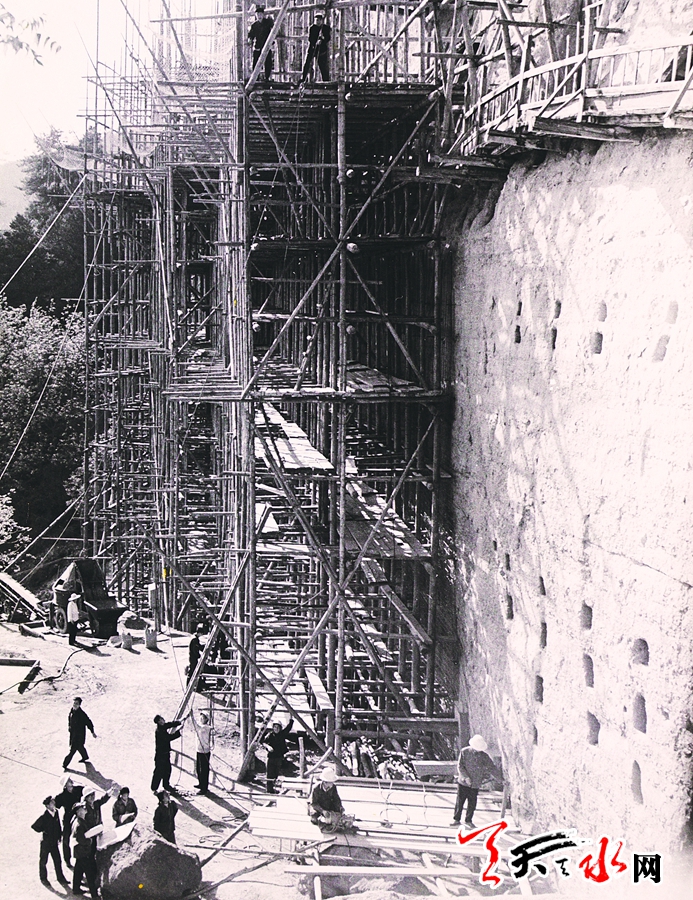 新中国成立后,麦积山石窟揭开了新的篇章。1952年至1953年,为配合西北区文化部勘察组和中央人民政府文化部勘察团的勘察,在天水专员公署主持下,由文得权等人攀登悬崖峭壁,架通了800多米长的凌空栈道。由吴作人先生执笔撰写的《麦积山勘察团工作报告》中这样写道: