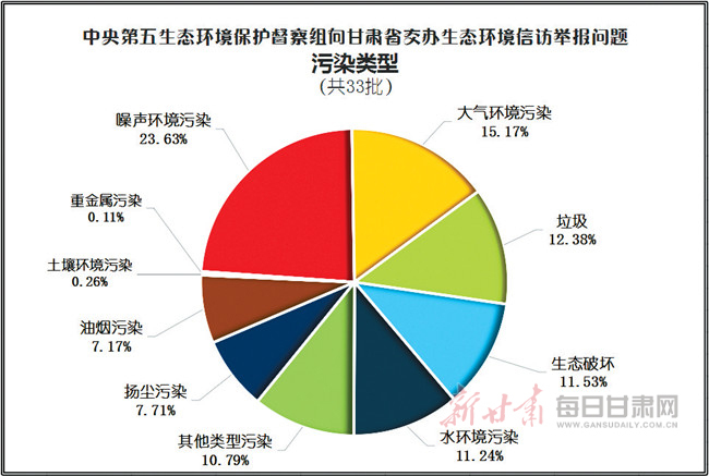 经统计,三十三批次转办的2643件生态环境信访举报问题中,噪声环境污染类问题占比23.63%,大气环境污染类问题占比15.17%,垃圾类问题占比12.38%,生态破坏类问题占比11.53%,水环境污染类问题占比11.24%,扬尘污染类问题占比7.71%,油烟污染类问题占比7.17%,土壤环境污染类问题占比0.26%,重金属污染类问题占比0.11%,其他类型占比10.79%。