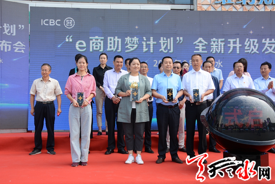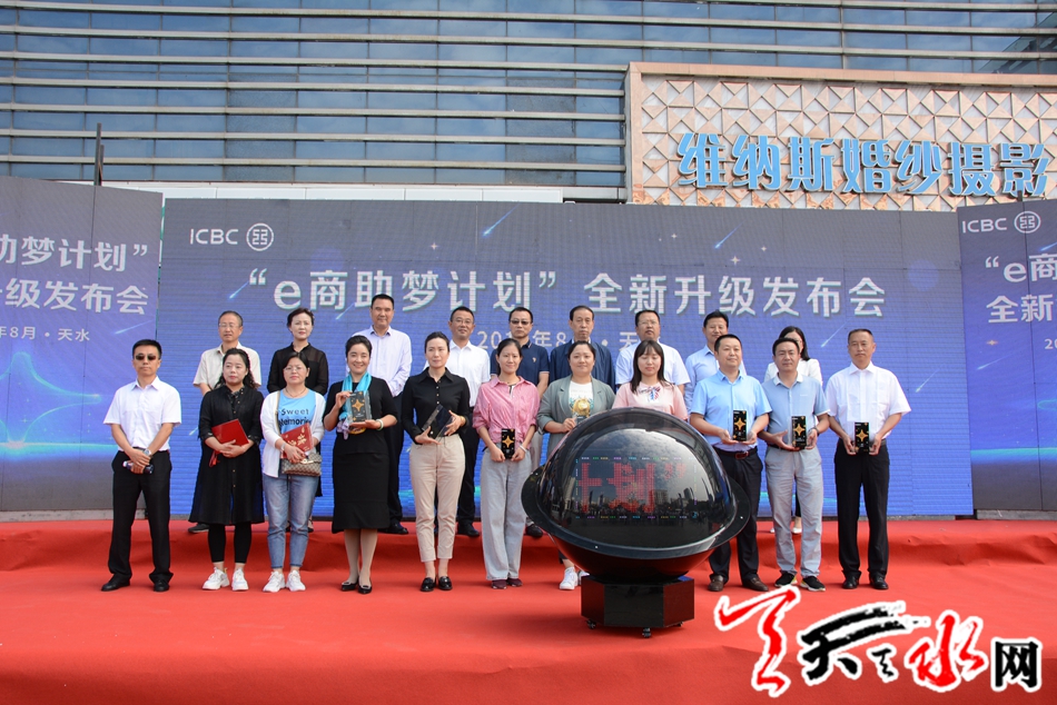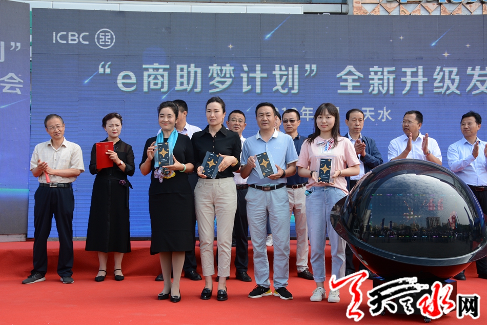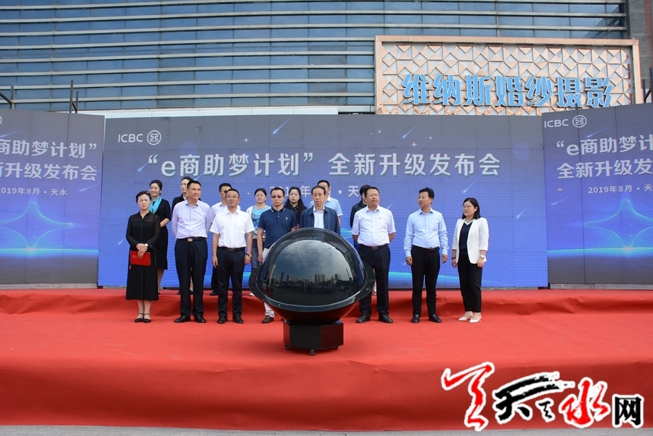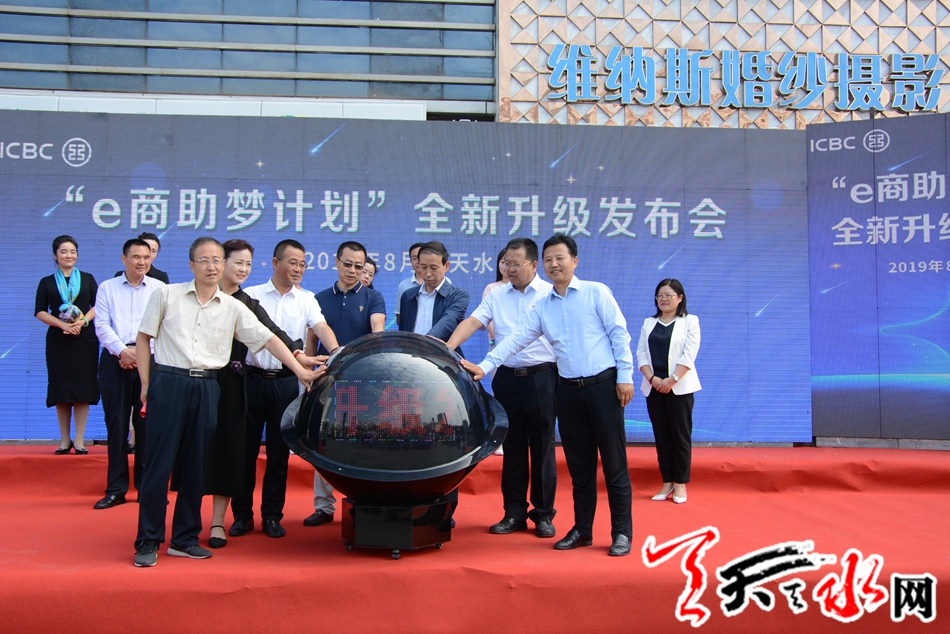 发布会现场,天水市政府副秘书长王小春、天水市政府金融办副主任胡波、中国银行保险监督管理委员会天水监管分局纪委书记王新宁、天水市商务局副局长蔚浩然、中国工商银行甘肃省分行银行卡中心副总经理巨刚、天水分行行长鲁彬先共同启动“启动球”,“e商助梦计划”开启银企合作的“黄金时代”新篇章。