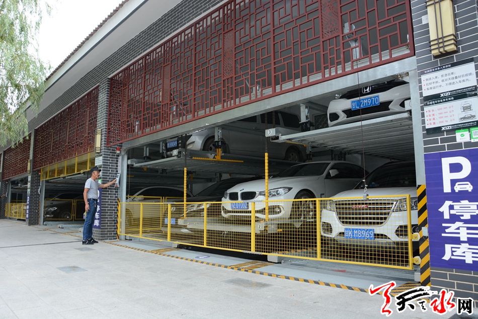 8月28日,在秦州区藉河北路市四零七医院南面的天水湖立体停车库前,一辆小轿车在管理人员的指挥下停放在停车库的车位后,管理人员通过按动操作键,又将这辆车调整上升至第三层,为第二层预留车位。记者在现场看到,在车辆停放高峰期,5个停车区可容纳40个车位的停车库已经停放了不少车辆。在此停车的一名车主告诉记者,有了这个停车库,在附近办事,再也不会为无处停车犯难了。