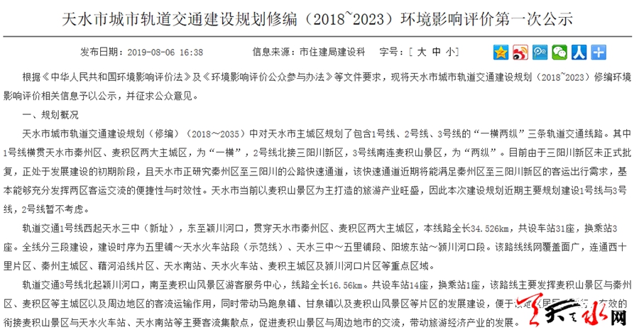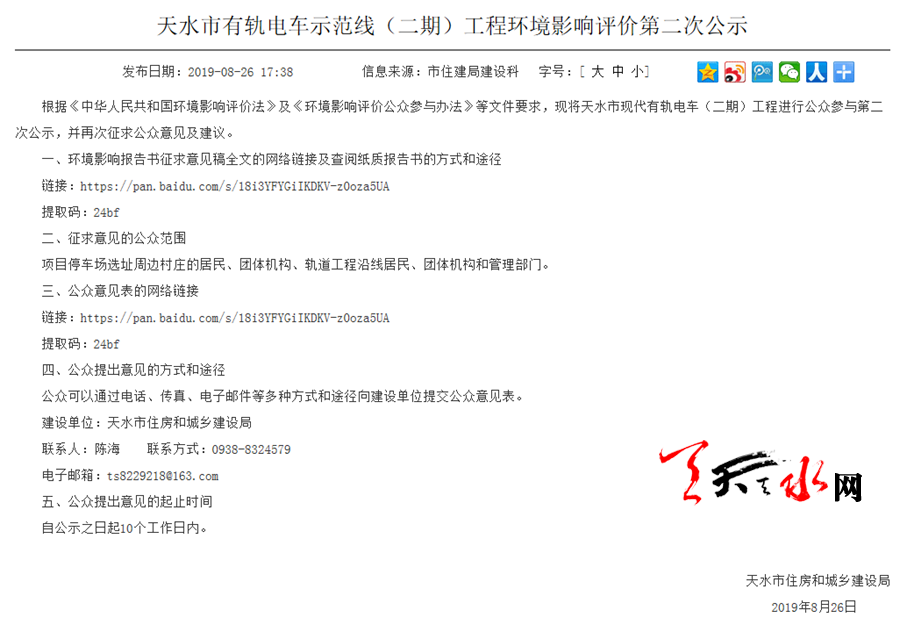 天天天水网讯 8月26日,天水市住房和城乡建设局发布一则公示信息,天水市有轨电车示范线(二期)工程开始二次环评公示。