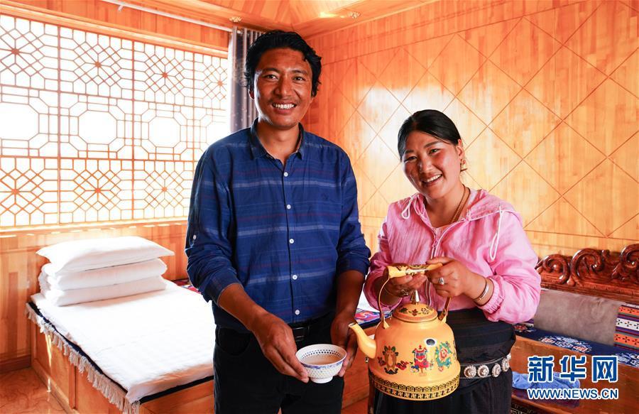 在甘肃省甘南藏族自治州碌曲县尕海镇尕秀村,旦增昂杰和尕藏草(右)夫妇在自己开办的“藏家乐”中(8月27日摄)。 近年来,甘南州用打造生态文明小康村的方式,提高旅游附加值,延长旅游产业链。旦增昂杰和尕藏草夫妇2017年开办了“藏家乐”,一年靠住宿餐饮能挣七八万元。 近日,新华社记者深入甘肃大地,行进式调研“三区三州”甘肃深贫区。在田间地头,在专业合作社,在扶贫车间,在易地扶贫安置点,在藏家民宿……记者用镜头记录下在决战决胜脱贫攻坚阶段的奋斗者群像,展现他们的奋斗姿态和充满幸福感、获得感的新生活。 新华社记者 陈君清 摄