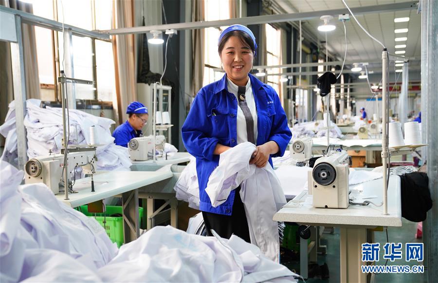 29岁的马梅英在甘肃省临夏回族自治州东乡族自治县达板镇一扶贫车间内(8月29日摄)。 马梅英2019年搬进了东乡族自治县易地扶贫安置点,她在安置点附近的扶贫车间参加了3个月的带薪培训后正式上岗缝制成衣。如今她已是熟练工,每个月有2000元的收入。 新华社记者 陈君清 摄