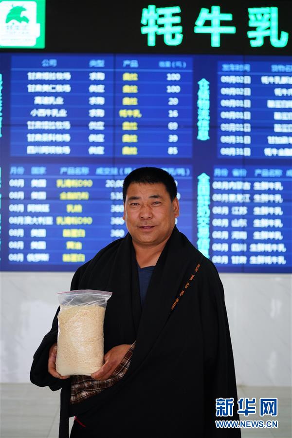 在甘肃省甘南藏族自治州合作市牦牛乳产业互联网原料交易中心,宁布塔展示他的“曲拉”(8月26日摄)。 藏语“曲拉” 意为牦牛牛奶提取酥油后的奶渣。以前,“曲拉”是牧民的日常食用品或牲畜初春补充的饲料。如今, “曲拉” 经当地牦牛乳制品企业加工,被制成了高附加值的干酪素产品。“曲拉”收购价格走高,原先的奶渣成为当地牧民脱贫增收的“金疙瘩”。新华社记者 陈君清 摄