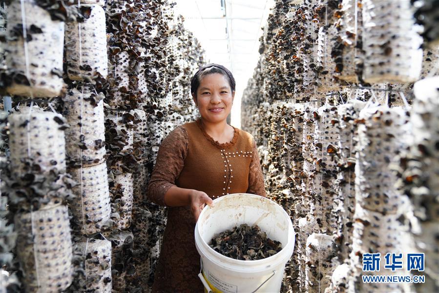 在甘肃省临夏回族自治州东乡族自治县高山乡布楞沟村一扶贫基地,热支弗展示她采摘的木耳(8月29日摄)。 热支弗除了种玉米、照顾孩子,还在村里的扶贫基地摘木耳,一天有一百元的收入,实现了务农、打工、顾家三不误。 新华社记者 陈君清 摄