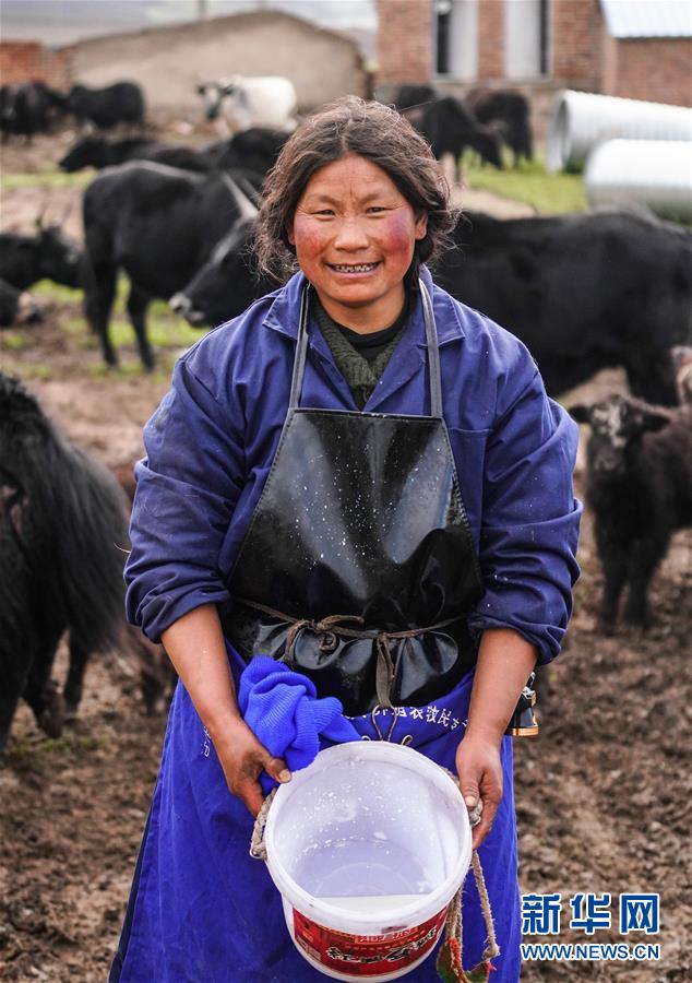 在甘肃省甘南藏族自治州合作市那吾镇多河村一农牧民专业合作社,挤奶工贡保吉展示她的劳动成果(8月27日摄)。 贡保吉现在每个月有2600元的工资,她家曾经是建档立卡户,2014年全家脱贫。 新华社记者 陈君清摄