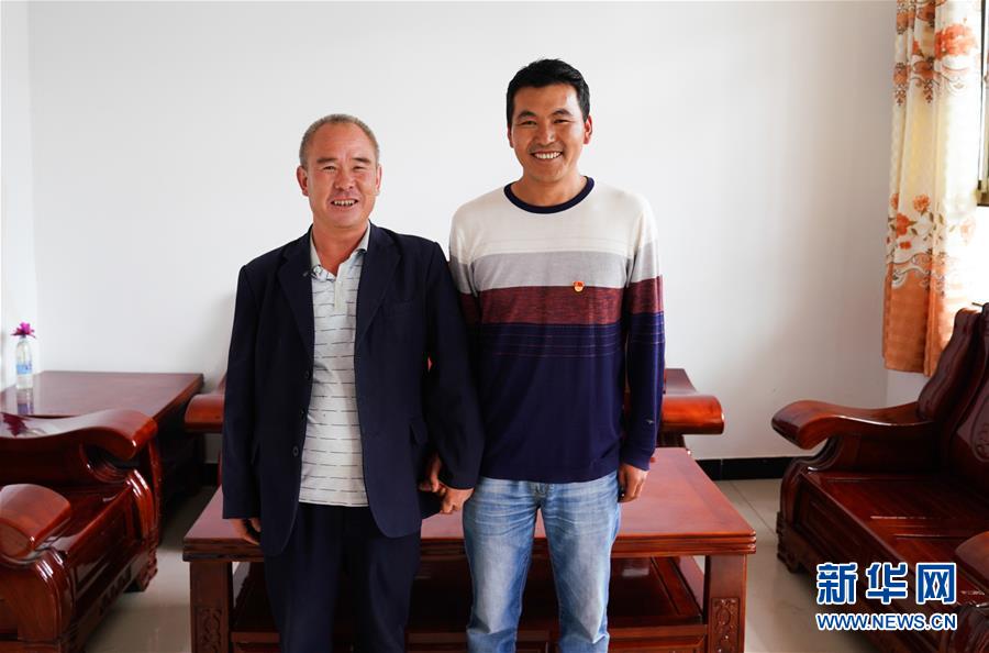 在甘肃省临夏回族自治州临夏县掌子沟乡白土窑村,包村干部马兴龙来到村民吴玉林(左)易地搬迁安置点的家中探访(8月28日摄)。 临夏州境内全是深沟大壑,一座山养不起一方人。白土窑村易地搬迁工程启动后,66岁的吴玉林和分散在沟沟壑壑的26户群众一起,没花一分钱集中搬进了巷道整洁、院落干净、通水通电的安置点。吴玉林住进新房,村里还吸收他在合作社种植作物实现增收,过上了新生活。新华社记者 陈君清 摄