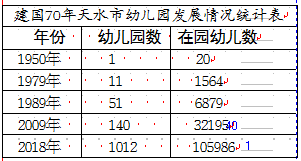 ■学前教育跨越发展。1950年,天水第一所幼儿园天水专区保育院成立,入园儿童只有20人,在70年的发展历程中,全市幼儿园总数达1012所,在园幼儿10.6万人,教职工6829人,实现了1500人以上有需求的行政村幼儿园全覆盖,共有省级示范性幼儿园7所,市级标准化幼儿园39所,学前三年毛入园率达到93.1%。