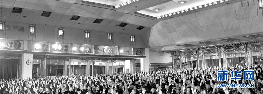 出席第一次全国人民代表大会的代表举手通过周恩来作的《政府工作报告》(资料照片)。 新华社发