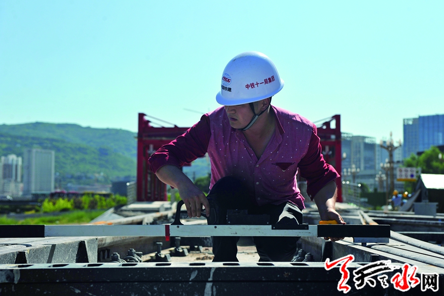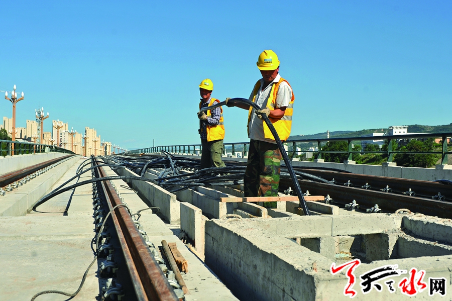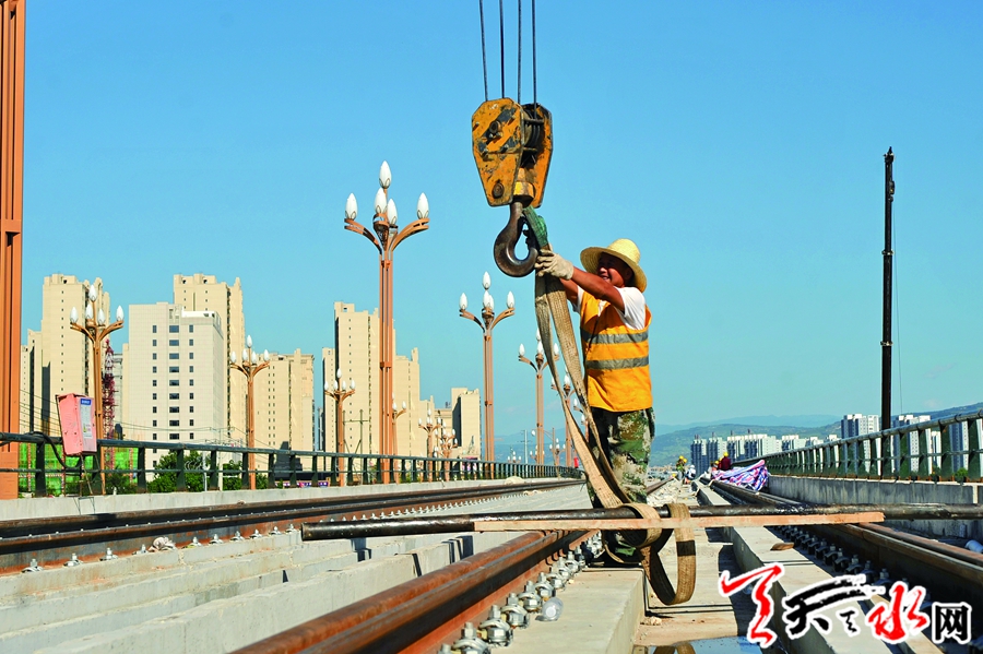 走进天水有轨电车施工现场,钢轨延伸,铺设线缆和建设车站的工人在加班加点施工,为确保工程如期完工坚守岗位。