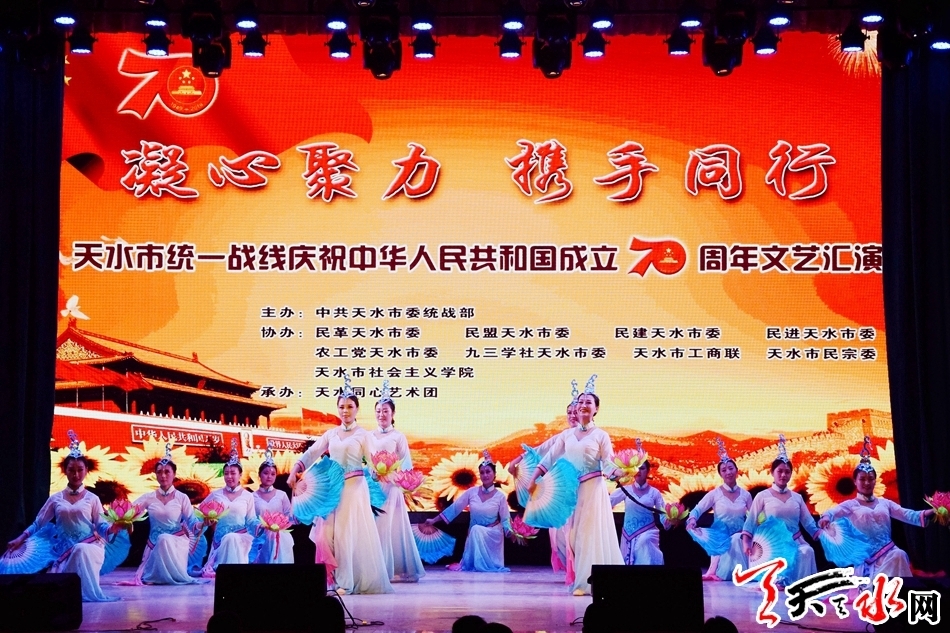 天天天水网讯【全媒体记者冯丽娟】9月11日,由市委统战部主办,民革天水市委、民盟天水市委、民建天水市委、民进天水市委、农工党天水市委、九三学社天水市委、天水市工商联、天水市民宗委、天水市社会主义学院承办的“凝心聚力 携手同行”——全市统一战线庆祝中华人民共和国成立70周年文艺汇演在师院礼堂举行。