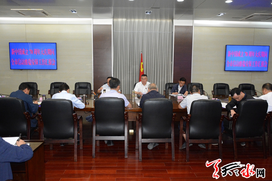 天天天水网讯【全媒体记者马哲】9月11日,市委常委、政法委书记蒲军主持召开新中国成立70周年大庆期间全市信访维稳安保工作汇报会,听取各县区、市直相关部门工作情况汇报,并就进一步贯彻落实全省、全市新中国成立70周年大庆信访维稳安保工作动员会议和市委国家安全委员会专题会议精神,防范化解重大风险隐患,全力做好新中国成立70周年大庆期间信访维稳安保工作进行全面安排部署。