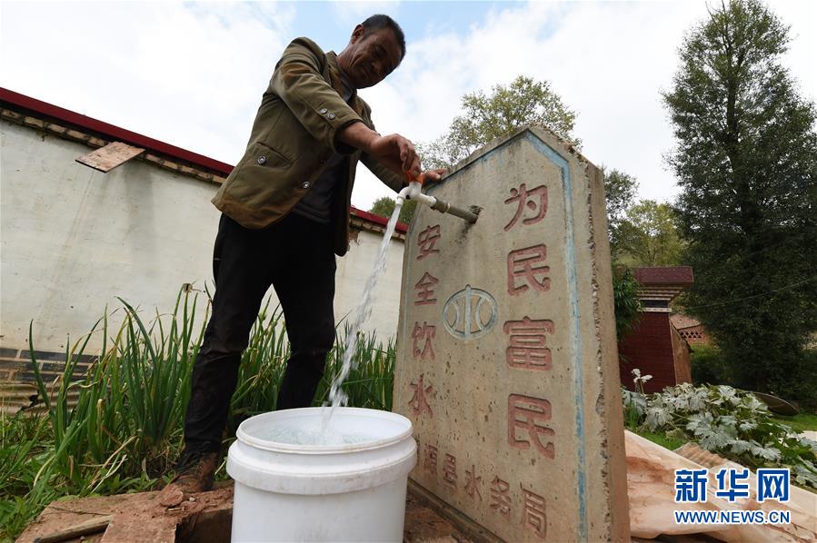 现在,渭源县元古堆村村民在自来水龙头前接水。摄于2019年9月。新华社记者 范培珅 摄