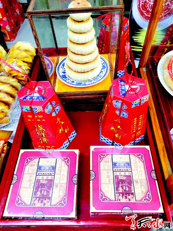 在秦州区光明巷的盛祥斋,门前各种不同包装的月饼也摆了起来,有宝塔状的,也有牛皮纸袋封好的苏式月饼,还有用保鲜膜裹起来的“大团圆”。店主张伟是甘肃烹饪面点大师,这间包含了天水传统饮食的老店,也算是我市一张重要的“城市名片”。年近四十的张伟戴着一副眼镜,不善言谈的他常常是在店内默默做着各种天水传统美食,而妻子刘芳则负责招呼顾客,时而帮忙打打下手。