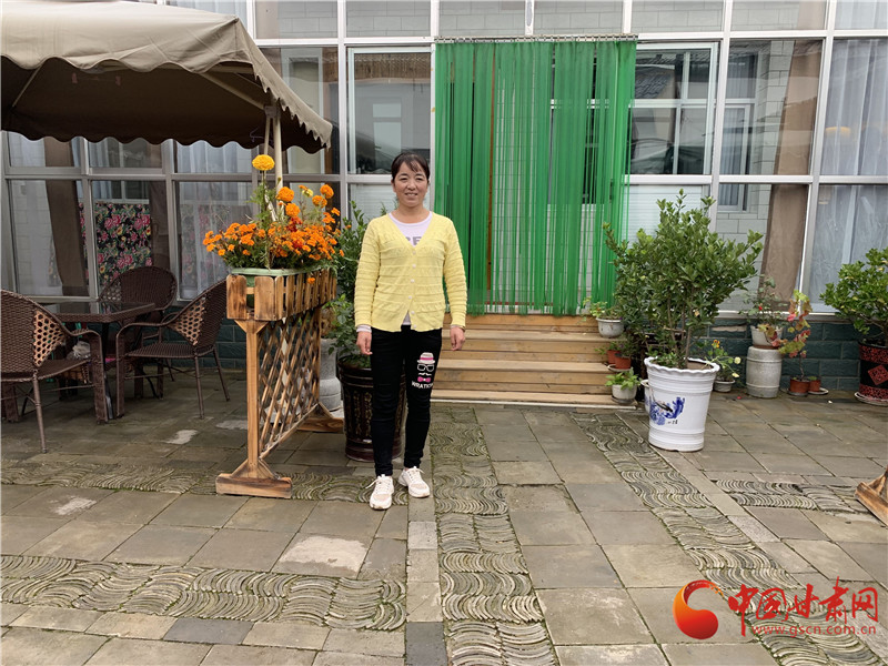 9月18日下午,参加脱贫攻坚地方行——看甘肃线下走访活动的记者们走进冯金秀的家中。一进院子,映入眼帘的是一栋窗明几净的二层小楼,院子两边种满了鲜花,摆放着几张咖啡桌,冯金秀坐在桌旁,满脸笑意地跟记者聊着自己从一个普通农民变成民宿股东的故事。