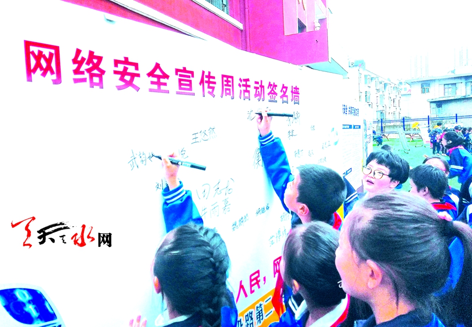 9月18日,天水市建二小学学生在网络安全宣传周活动签名墙上写下自己的名字。本报记者 孙镇 摄