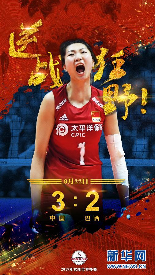 海报:逆战狂野! 9月22日,在日本札幌举行的2019年女排世界杯赛第二阶段A组循环赛比赛中,中国队以3比2战胜巴西队,获得六连胜。 新华社发