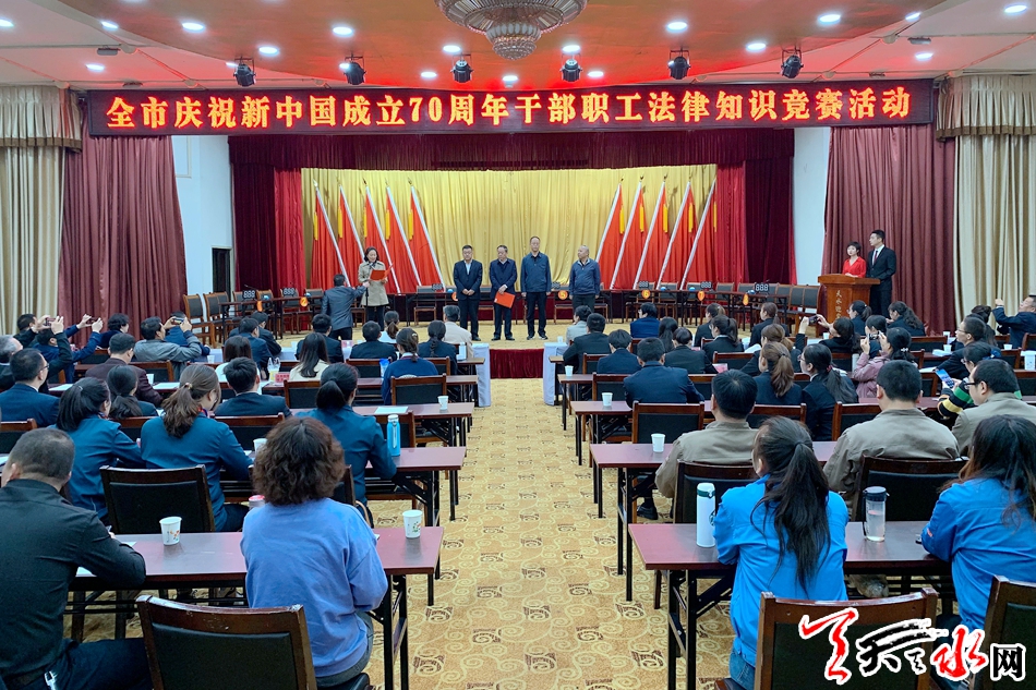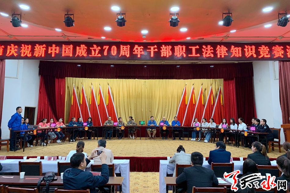 天天天水网讯【全媒体记者童强】9月20日至21日,由市总工会、市人社局、市工信局、市司法局联合举办的庆祝新中国成立70周年全市干部职工法律知识竞赛在天水迎宾馆举行。来自全市各县区、市直部门和驻市企业23支代表队,共计120余人参加比赛。