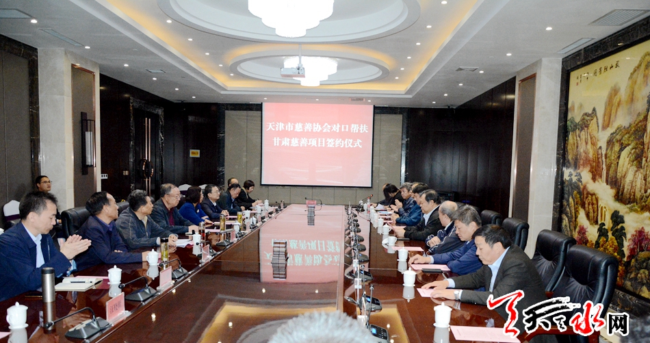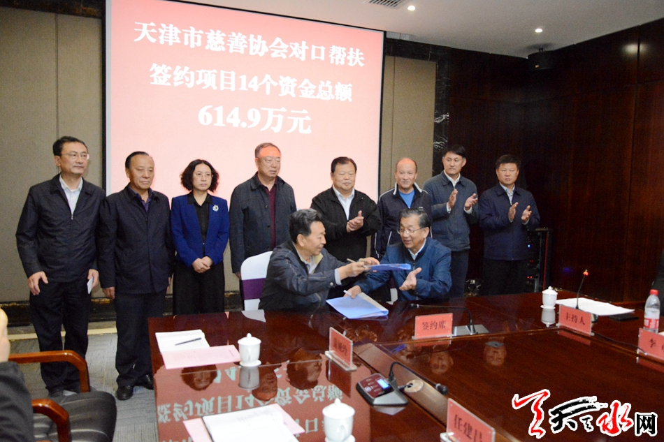 天津市慈善协会副会长兼秘书长兰国樑、甘肃省慈善总会副会长张和平代表两地签订了总资金614.9万元的14个第一批援助甘肃慈善项目协议书。其中援助我市项目分别是清水县关爱儿童之家项目、清水县点亮乡村工程项目、秦安县乡村道路援建项目,援助资金共110万元。