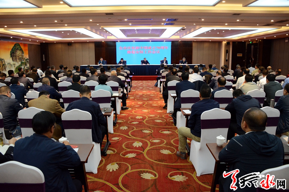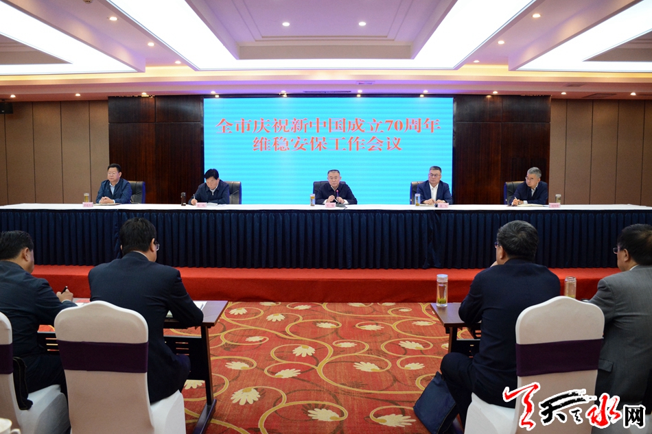 天天天水网讯【全媒体记者 王晓馨】9月24日, 市委书记王锐主持召开全市庆祝新中国成立70周年维稳安保工作会议。他强调,全市各级各部门要深入贯彻落实习近平总书记视察甘肃重要讲话精神,进一步提高政治站位,强化责任担当,聚焦重点关键,狠抓措施落实,为庆祝新中国成立70周年营造安全稳定的政治社会环境。
