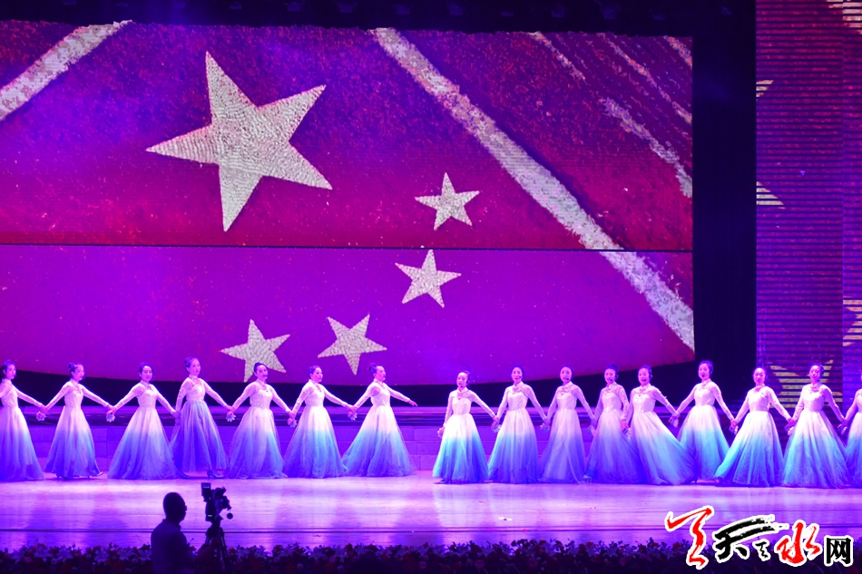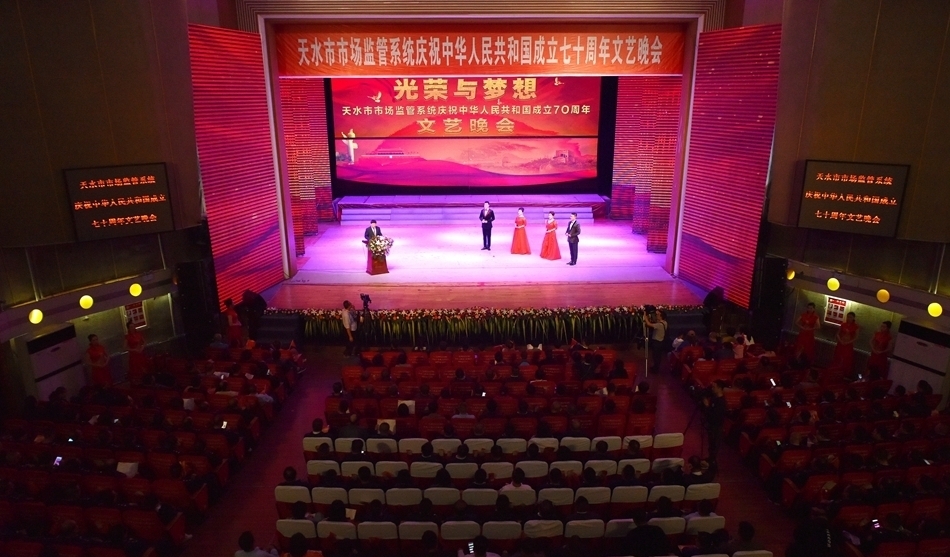 9月23日晚,天水市市场监管系统庆祝中华人民共和国成立70周年文艺晚会在秦州大剧院举行,市市场监管系统干部职工载歌载舞,唱响《我和我的祖国》,共筑《光荣与梦想》,颂扬祖国的辉煌成就,讴歌新时代的伟大梦想。市人大常委会主任蒋晓强, 省市场监督管理局副局长张矛,市委常委、组织部部长贾义翔,副市长王燕,市人大常委会秘书长杨坤观看演出。 全媒体记者 周文涛 摄