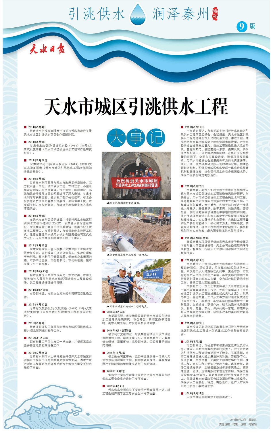 在天水市秦州区关子镇石川村举行天水市城区引洮供水工程2#隧洞开工仪式。甘肃省水利厅党组书记、厅长魏宝君出席开工仪式并讲话,市委书记王锐宣布工程开工,市委副书记、市长杨维俊主持开工仪式。这标志着甘肃水投天水供水有限责任公司正式成立运行,天水市城区引洮供水工程开工建设。