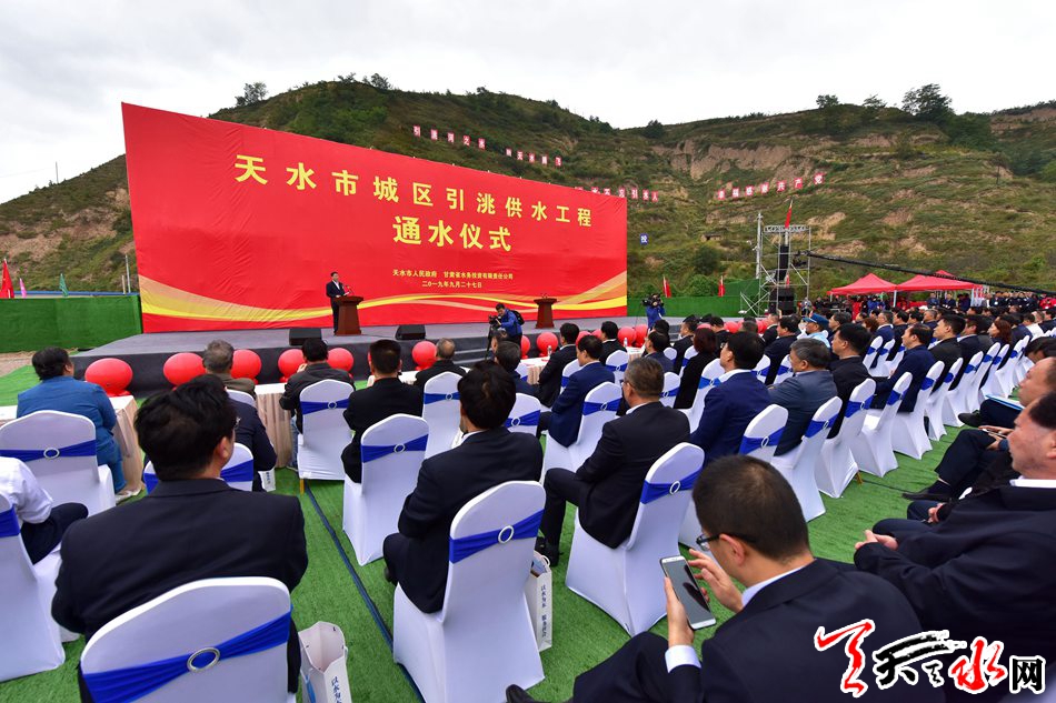 天天天水网讯【全媒体记者郝勤学 王晓馨】九月的天水,长空溢彩,大地流金。在举国上下欢庆新中国成立70周年之际,天水水利史上投资最大、规模最大的民生工程——天水市城区引洮供水工程9月27日上午正式通水,通水仪式在秦州区藉口镇杨家湾调蓄水池所在地盛大举行。从此,清冽甘甜的洮河水穿山越岭进入天水,将不仅从根本上解决长期困扰天水城区人民生活质量和发展的用水问题,而且为把天水建成省域副中心城市、建设幸福美好新天水提供坚强的水利支撑。 省委副书记孙伟出席通水仪式并宣布工程通水。
