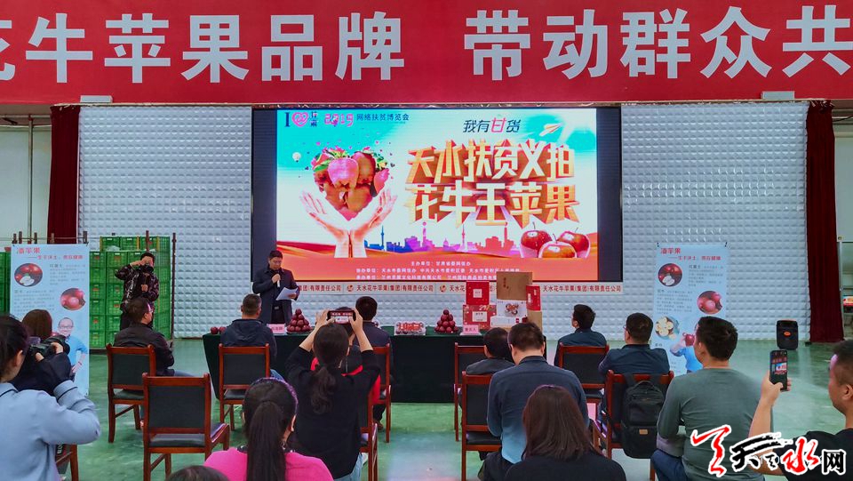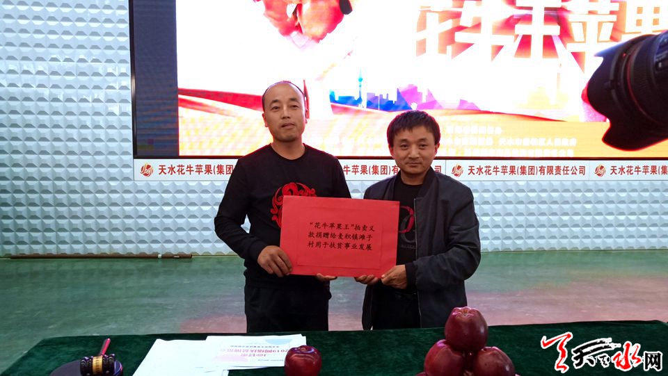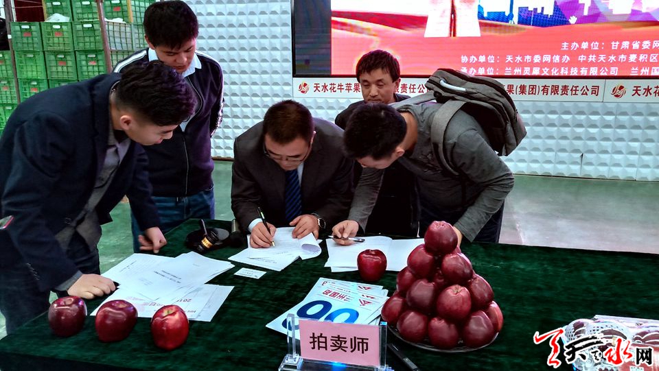 天天天水网讯【记者 张文都 实习生 巩丽珍】9月27日,由省委网信办发起的“I@甘肃网络扶贫博览会”天水站花牛苹果扶贫公益拍卖活动在麦积区东柯河工业园区花牛苹果集团有限公司举行。天水花牛苹果以其良好的品牌通过线上线下拍卖两万多斤,成交近三十万元。