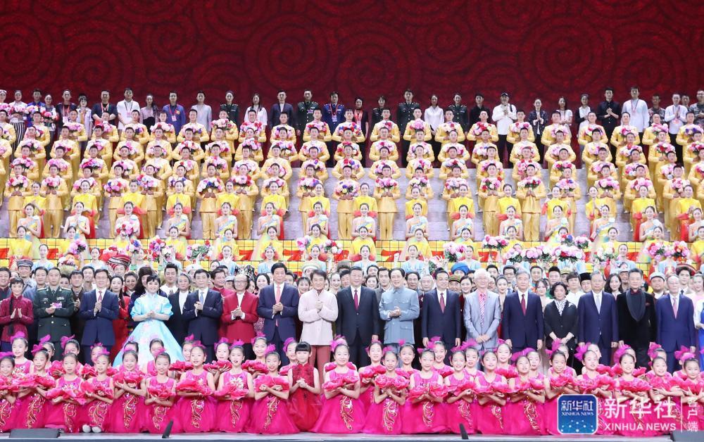 9月29日,庆祝中华人民共和国成立70周年大型文艺晚会《奋斗吧 中华儿女》在北京人民大会堂举行。习近平、李克强、栗战书、汪洋、王沪宁、赵乐际、韩正、王岐山等党和国家领导人同4000多名观众一起观看演出。演出结束后,习近平等走上舞台同演职人员合影留念。新华社记者 王晔 摄