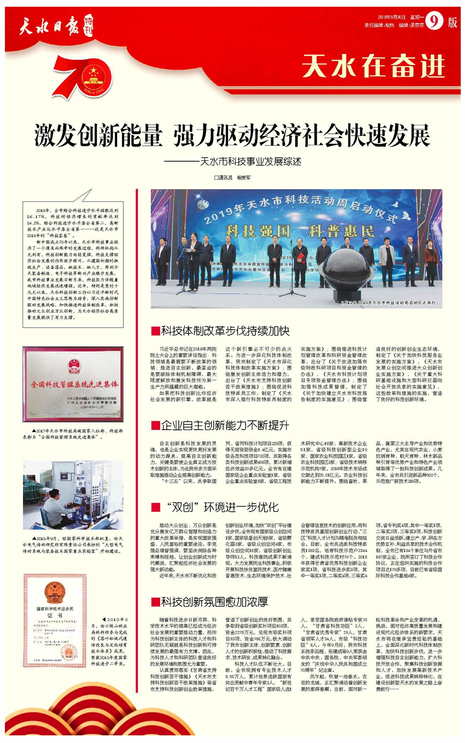 新中国成立70年以来,天水市科技事业经历了一个漫长而艰辛的发展过程,科研机构从无到有,科技创新能力由弱变强,科技支撑经济社会发展的作用逐步提升。从建国初期的粗放生产、设备落后,缺技术、缺人才,再到今天装备制造、电子科技等新兴产业稳步发展,我市科技事业发展日新月异,科技实力伴随着地域经济发展迅速增强。近年来,特别是党的十九大以来,天水科技创新工作以习近平新时代中国特色社会主义思想为指导,深入实施创新驱动发展战略,加快推进科技体制改革,积极推动大众创业万众创新,为天水经济社会高质量发展提供了有力支撑。