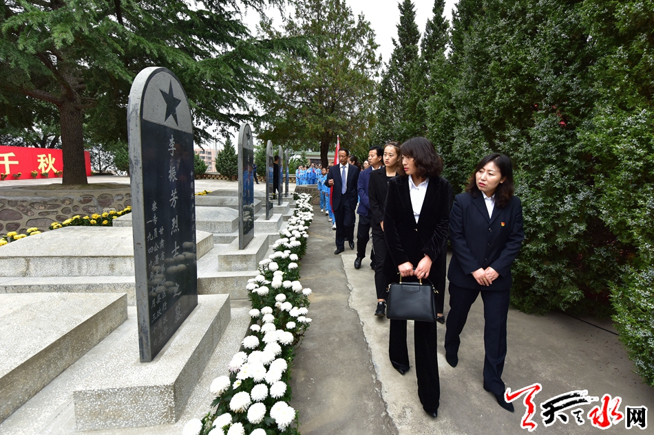 由市委、市人大、市政府、市政协、天水军分区、秦州区、民主党派人士和社会各界群众敬献的8个花篮一字排开,整齐摆放在烈士纪念碑前,花篮的红色缎带上写着“革命烈士永垂不朽”。伴随着深情庄严的《献花曲》,王锐、蒋晓强、王军、张明泰及各界代表来到花篮前驻足凝视,仔细整理花篮缎带,向烈士纪念碑三鞠躬。