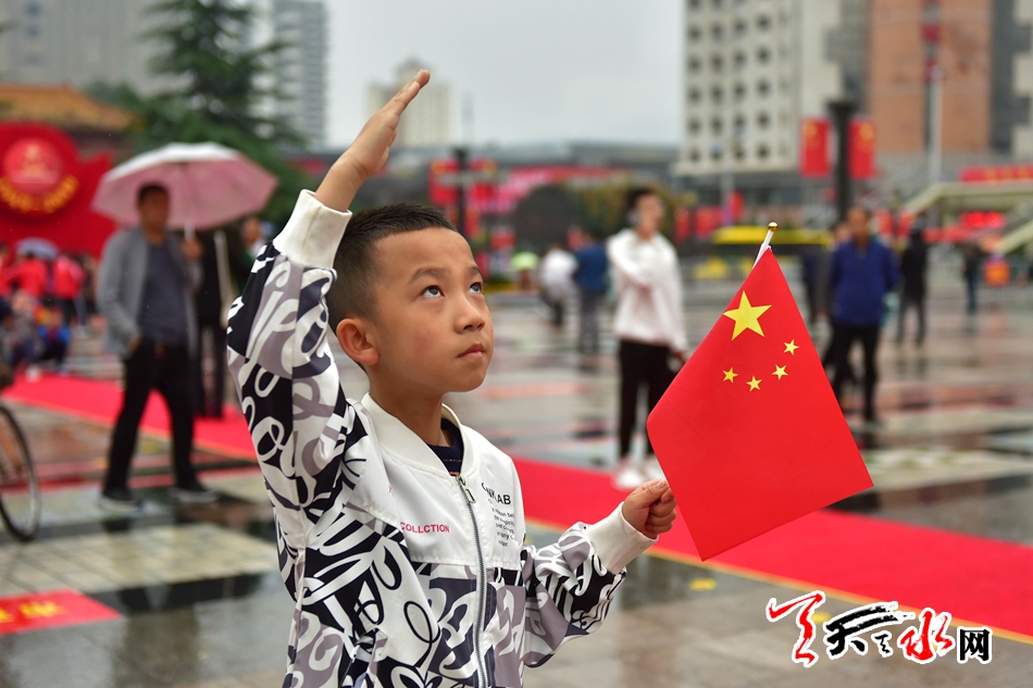 8时30分,天水市庆祝中华人民共和国成立70周年升国旗仪式正式开始。护旗手们迈着整齐有力的步伐,护送国旗至升旗台上。市委副书记、市长王军宣布:“升国旗,奏唱国歌。”随后,雄壮激昂的《义勇军进行曲》响起,旗手奋力挥臂,将国旗展开,鲜艳的五星红旗冉冉升起。全体人员庄严肃立,满怀深情,高唱中华人民共和国国歌,行注目礼。