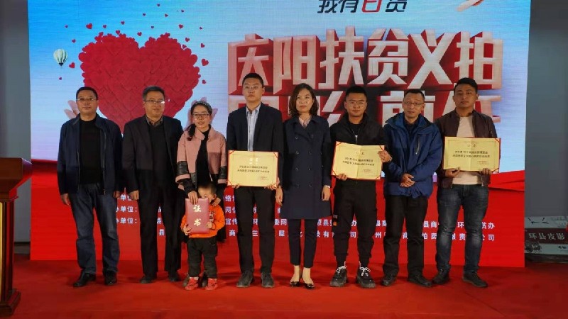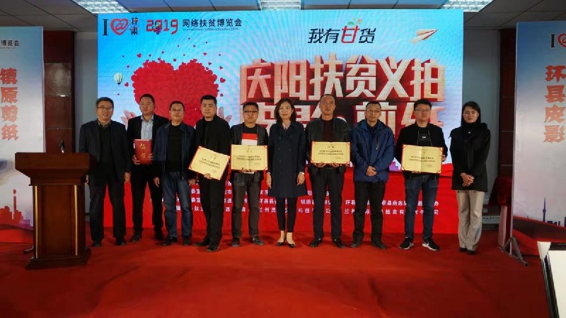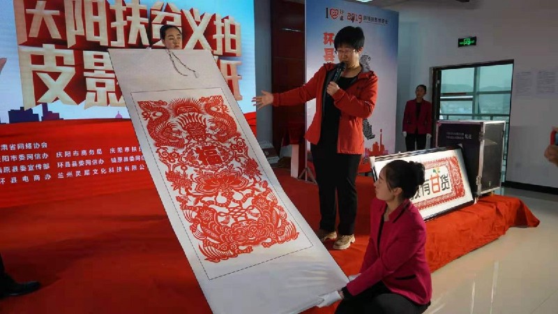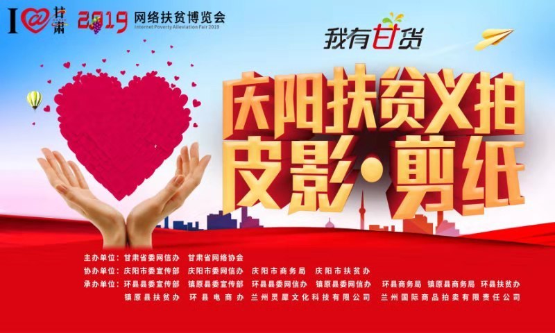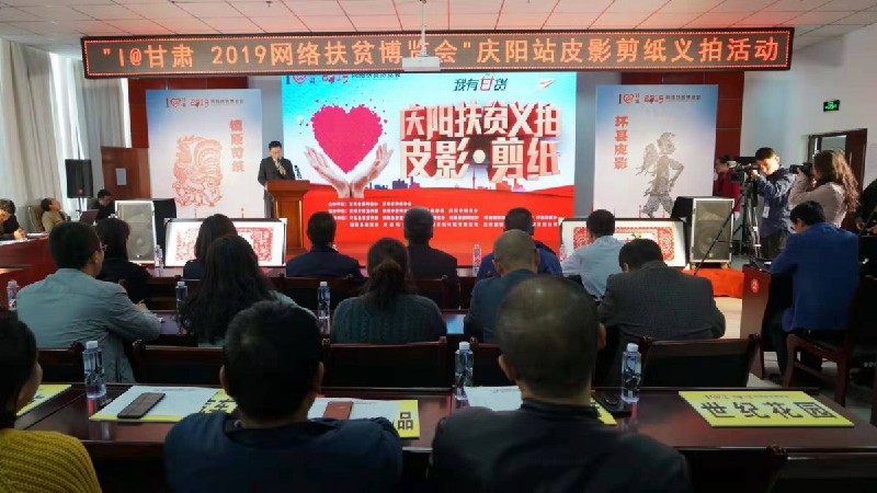 10月9日,由甘肃省委网信办、甘肃省网络文化协会主办,庆阳市委宣传部、庆阳市委网信办、庆阳市商务局、庆阳市扶贫办协办,环县委宣传部、镇原县委宣传部、环县委网信办、镇原县委网信办、环县商务局、镇原县商务局、环县扶贫办、镇原县扶贫办、环县电商办、兰州灵犀文化科技有限公司、兰州国际商品拍卖有限公司承办的“I@甘肃 2019网络扶贫博览会”庆阳站皮影、剪纸扶贫义拍活动,在环县电子商务公共服务中心举行。