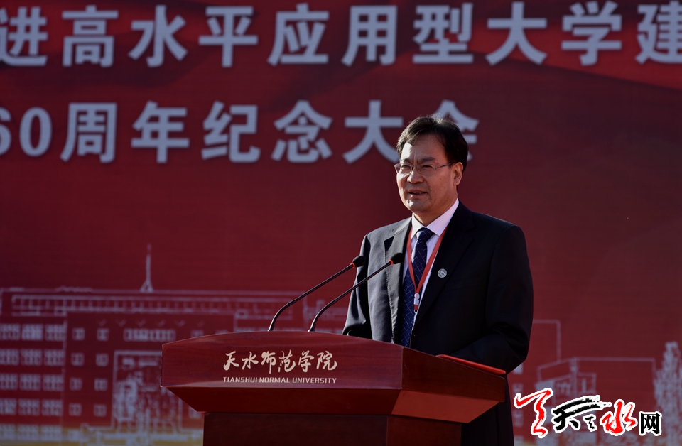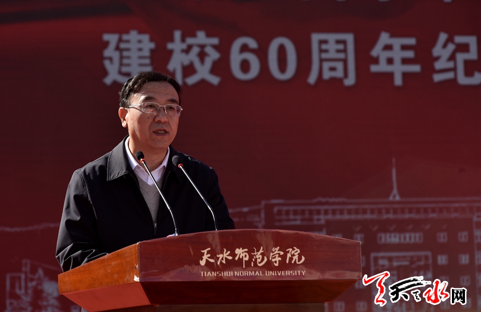 李沛兴代表省委、省政府向天水师范学院建校60周年表示热烈的祝贺,向全体师生、员工及广大校友,致以诚挚的问候和美好的祝愿。他说,天水师院建校60年来,始终恪守“明德、新民、至善”的校训,弘扬“困境中求生存,奋斗中谋发展”的精神,注重思政育人,注重文化育人,注重产教融合,注重学生综合素质提高,先后培养了一大批高素质应用型人才,为甘肃经济社会发展,尤其是基础教育事业作出了不可替代的贡献。希望天水师范学院以60周年校庆为契机,以习近平新时代中国特色社会主义思想为指导,深入学习贯彻习近平总书记视察甘肃重要讲话和指示精神,全面加强党的领导,把立德树人作为根本任务,坚持扎根陇东南,坚守育人初心,高举师范大旗,全面振兴本科教育,积极发展研究生教育,为甘肃省基础教育培养更多优秀师资;坚持加强科技创新,主动服务国家战略和地方需求,在创新驱动助推区域经济发展和脱贫攻坚方面做出更大贡献;坚持师德懿范,筑魂育人,践行“三传播、三塑造”要求,努力培养堪当“富民兴陇”重任的社会主义建设者和接班人;坚持走应用型大学发展之路,瞄准“西部一流、国内知名”方向,打好“深化改革、转型发展、人才队伍建设、办学条件改善”四场攻坚战,大力推进教学、科研、学科等重点领域综合改革,不断提升办学水平,建好师范特色鲜明的高水平应用型大学。
