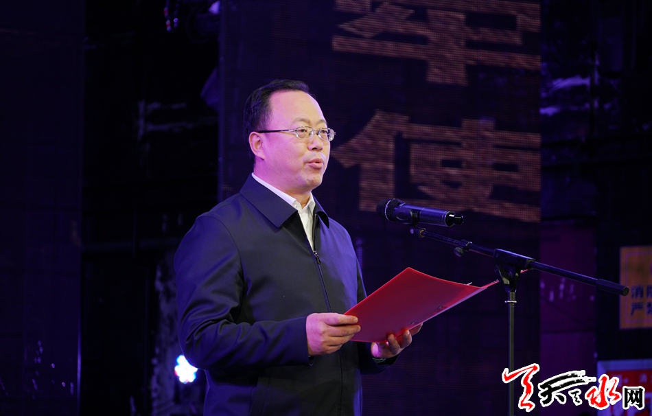 贾义翔在报告会上致辞。他强调,举办“最美奋斗者”—张富清同志先进事迹情景天水报告会,共同学习老党员、老英雄张富清同志的先进事迹和优秀品质,既是全市各级党组织、广大党员贯彻落实习近平新时代中国特色社会主义思想的具体实践,也是深入推进“不忘初心、牢记使命”主题教育的重要举措,更是一堂坚定信念、锤炼党性的红色党课。全市各级党组织要通过多种方式对张富清同志先进事迹进行广泛宣传,努力营造学习先进、争当先进的良好氛围。要号召全市广大党员干部学习张富清同志坚守初心、对党忠诚、一心为公、忘我无私的政治品格,淡泊名利、扎根基层、默默耕耘、乐于奉献的高尚情操,进一步增强“四个意识”、坚定“四个自信”、坚决做到“两个维护”,自觉做习近平新时代中国特色社会主义思想的坚定信仰者和忠实实践者,不忘初心、牢记使命,为建设幸福美好新天水不懈奋斗。