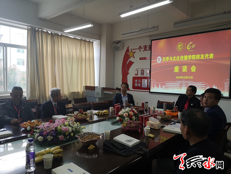 天天天水网讯【记者 王军祥】10月12日,在庆祝学校建校六十周年之际,天水师范学院各学院分别举行校友师生座谈会。来自不同地区、不同职业、不同年龄的校友们追忆了当年在天水师范学院求学期间的历历往事,并结合工作体会,由衷感谢母校的精心培养和老师们的谆谆教诲,对学院的未来发展积极建言献策。