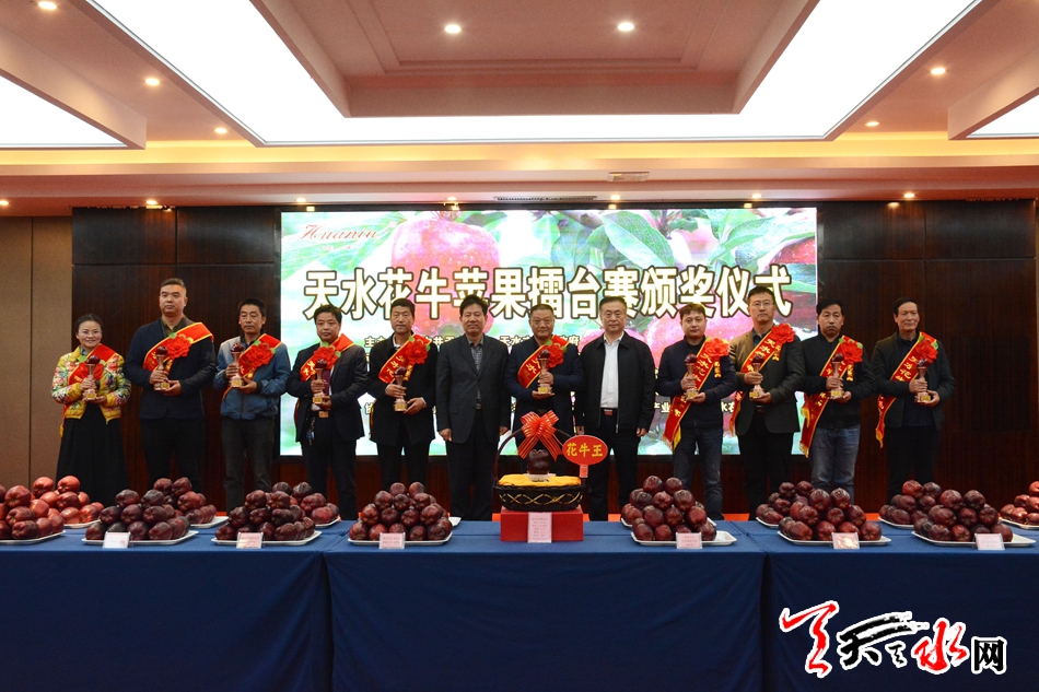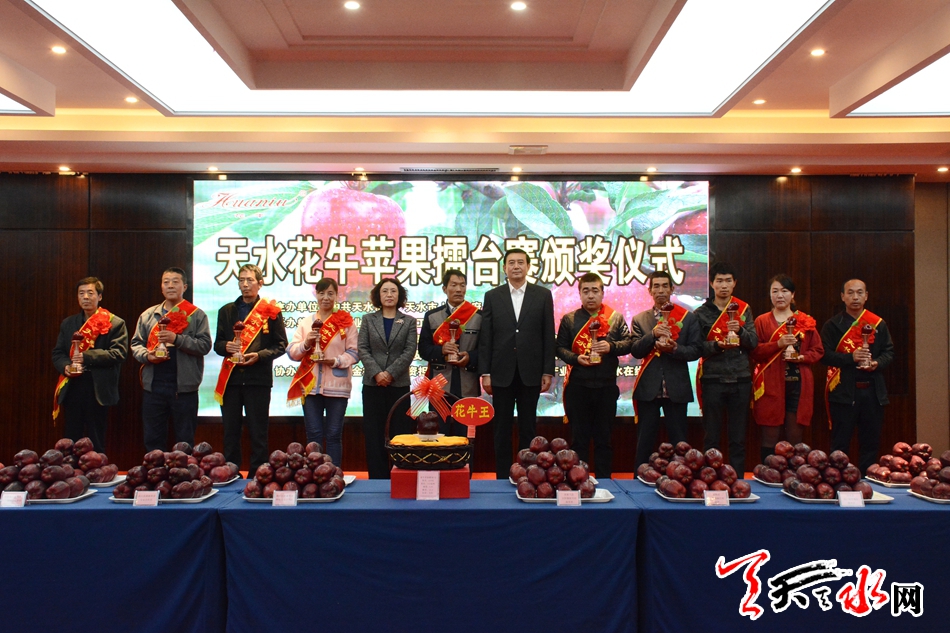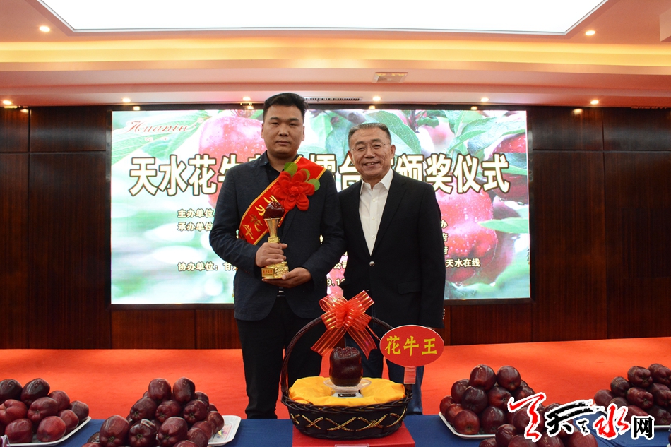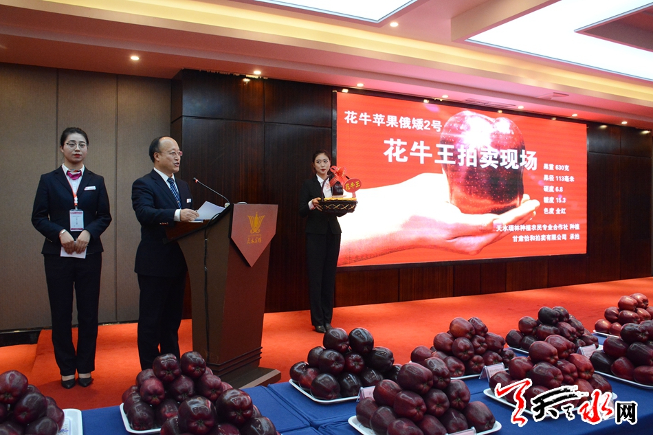 天天天水网讯【全媒体记者 王晓馨】10月15日,由市委、市政府主办的花牛苹果擂台赛暨拍卖爱心认购活动举行。省政协副主席、天水市委书记王锐为喜获“花牛王”的天水瑞林种植农民专业合作社负责人李玉明颁奖。