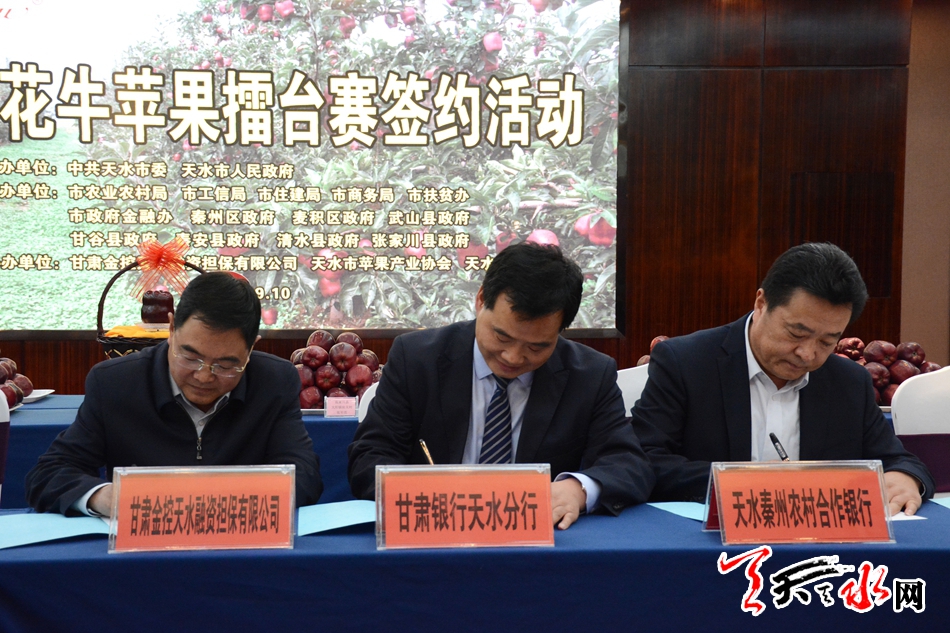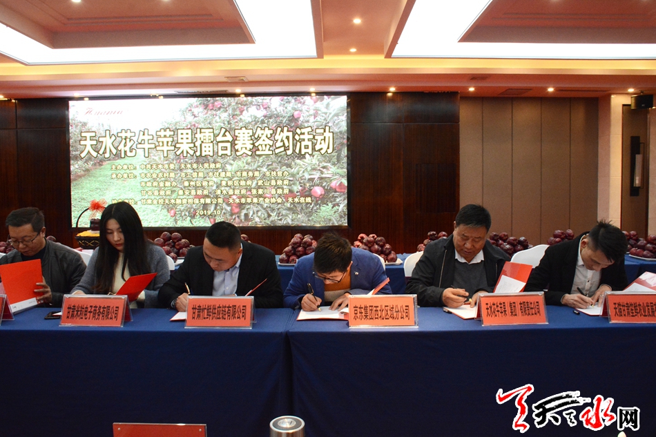 签约仪式上,驻市金融机构、担保机构、果品营销企业共签订果品收储专项贷款5930万元;天猫甘肃笙鲜农业发展有限公司、京东集团片区分公司等电商企业与果品营销企业签约销售花牛苹果1.6万吨,销售总额8000万元;麦积区、秦安县、清水县、甘谷县、武山县政府分别和天津东西协作定点帮扶单位签约花牛苹果扶贫消费8900吨,销售总额7120万元。