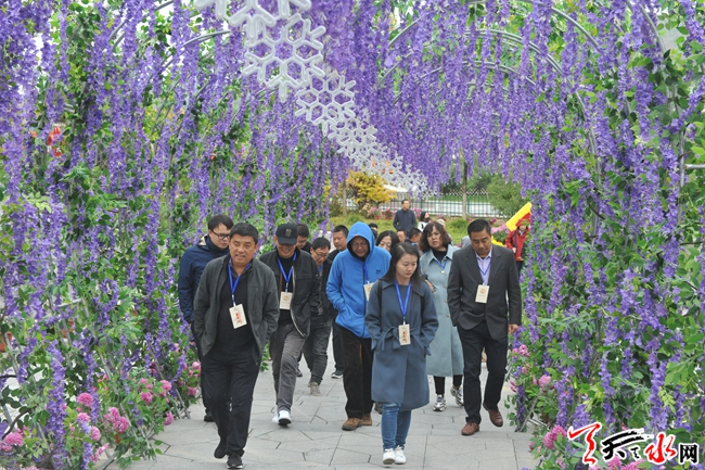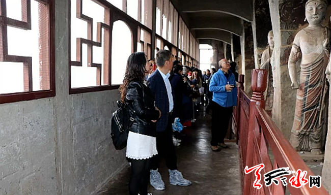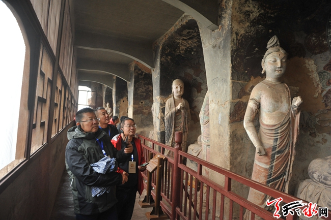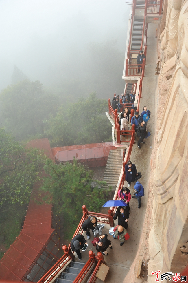 天天天水网讯10月15日,前来参加第四届“中国天水·李杜诗歌奖”颁奖盛典暨 全国著名作家诗人感知天水历史文化采风活动的近百名诗人和作家在麦积山石窟进行参观采风。