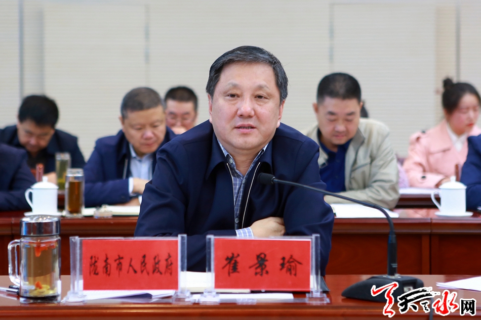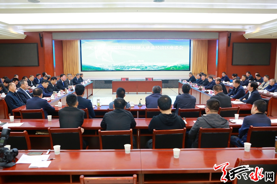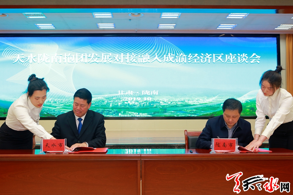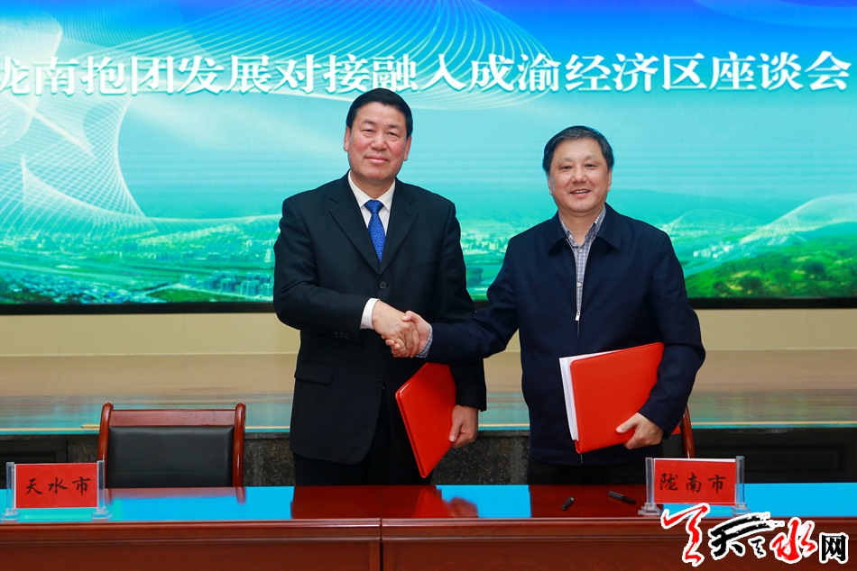 座谈会上,王军、崔景瑜分别介绍了两市市情、发展优势以及各自对于组团发展、对接融入成渝经济区的思路和打算。王军说,天水与陇南山水相连,地缘相近,人文相通,自古以来经济文化交流十分频繁,是好兄弟、好邻居、好伙伴,具有合作发展的良好基础。特别是今年8月,省政府出台了《关于支持天水陇南对接融入成渝经济区的意见》,这为两市紧密合作、抱团发展提供了千载难逢的重大政策机遇。希望双方以签署《对接融入成渝经济区合作行动计划》为契机,携手共进,互利共赢,进一步加强优势互补,深化基础设施互联互通,推进文旅、农业、现代商贸物流、康养等产业深度合作,加强生态环境、社会事业等领域广泛交流,更好地发挥南北通道优势和交通物流枢纽作用,抱团融入成渝经济区,共同打造我省南向扩大开放促发展的先行区、甘川渝毗邻区开放合作的试验区和西北西南共建“一带一路”和陆海新通道的协作区。