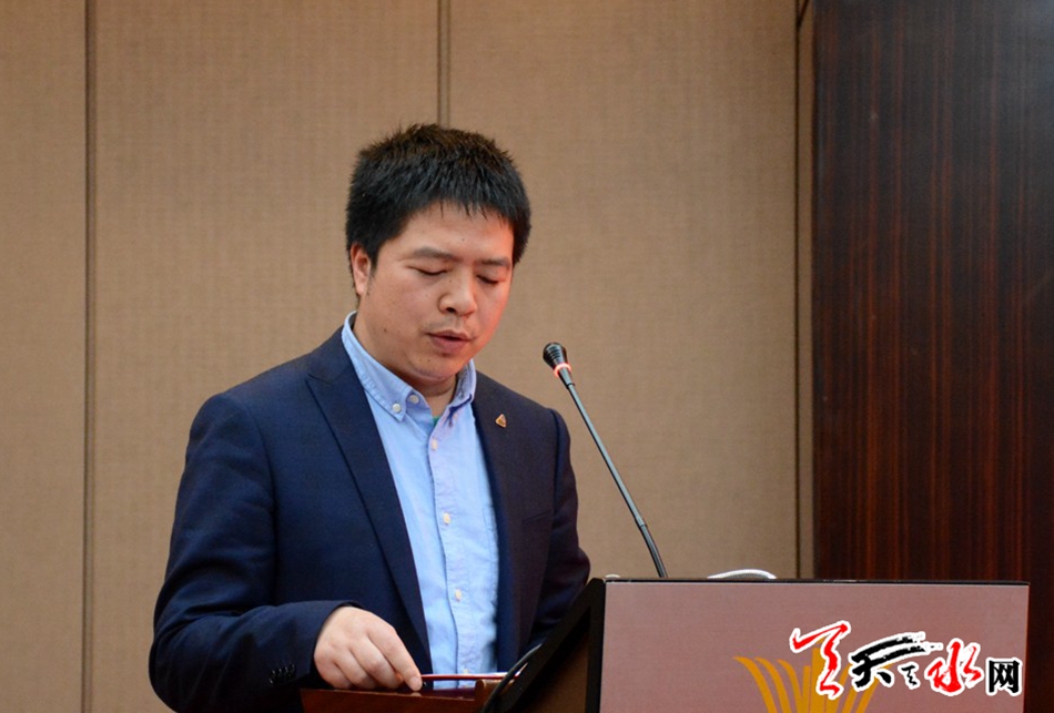 (天水市房地产业协会副秘书长吴树斌宣读《房地产企业花牛苹果爱心认购倡议书》)