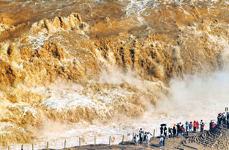 壶口瀑布是黄河流经秦晋大峡谷时形成的一个天然瀑布,其奔腾不息、磅礴汹涌的气势被视为中华民族自强不息、百折不挠、勇往直前精神的象征。“风在吼,马在叫,黄河在咆哮……保卫家乡!保卫黄河!保卫华北!保卫全中国!”1939年,正是这里的壮观景象激发了创作者的灵感,写出脍炙人口的《黄河大合唱》。图为游客在位于山西省吉县的黄河壶口瀑布游览(摄于2019年6月30日)。 视觉中国 吕桂明/摄