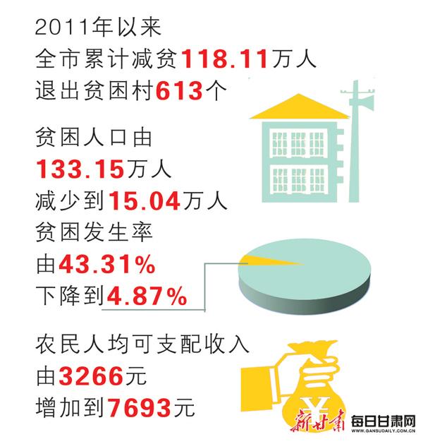 近年来,天水市举全市之力打赢打好脱贫攻坚战,人民生活实现了从“缺吃少穿”到“丰衣足食”再到“总体小康”的历史性跨越,即将步入“全面小康”的新阶段,基本实现了村村有主导产业、户户有致富门路。2011年以来,全市累计减贫118.11万人,退出贫困村613个,贫困人口由133.15万人减少到15.04万人,贫困发生率由43.31%下降到4.87%,农民人均可支配收入由3266元增加到7693元。