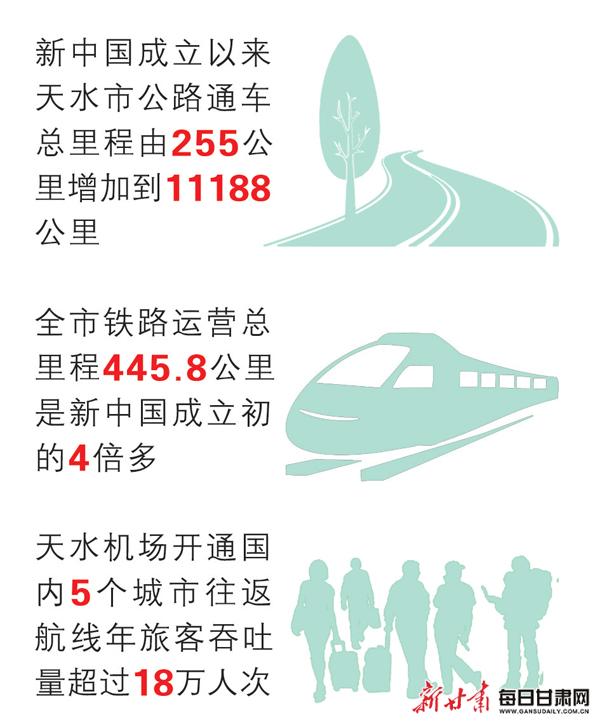 新中国成立以来,天水市公路通车总里程由255公里增加到11188公里;全市铁路运营总里程445.8公里,是新中国成立初的4倍多;天水机场开通国内5个城市往返航线,年旅客吞吐量超过18万人次。全市安全饮水、有线广播电视、光纤网络、农村电网实现全覆盖;城区供水普及率98.94%,燃气普及率78.71%。全市道路交通、供水供电、通讯设施等基本生活条件发生翻天覆地的新变化。