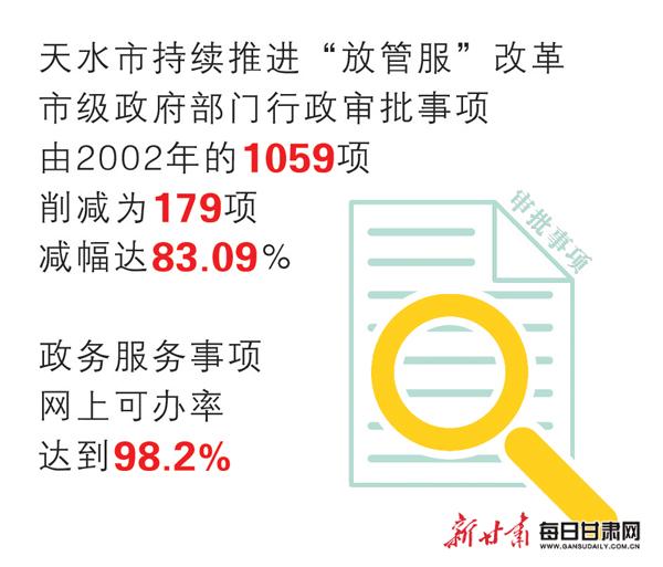 天水市持续推进“放管服”改革,市级政府部门行政审批事项由2002年的1059项削减为179项,减幅达83.09%,政务服务事项网上可办率达到98.2%,企业开办时间压缩至5个工作日以内,吸引了万达、碧桂园、恒大、绿地、世贸、天适等国内知名企业先后进驻天水或达成投资协议。