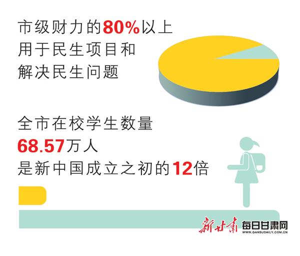 天水市加大保障和改善民生力度,市级财力的80%以上用于民生项目和解决民生问题。全市各类中小学达到3164所,在校学生数量68.57万人,分别是新中国成立之初的4倍和12倍。每千人卫生技术人员、执业医师以及注册护士分别达到4.58人、1.63人和1.86人,医疗卫生机构、床位、技术人员分别比1949年增长477倍、2776倍和66倍。居民人均预期寿命从1949年的35岁提高到2018年的74.75岁。