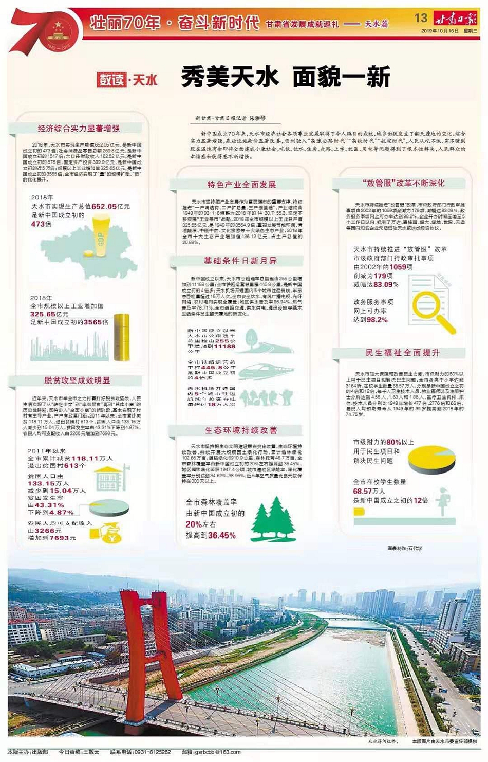 新中国成立70年来,天水市经济社会各项事业发展取得了令人瞩目的成就,城乡面貌发生了翻天覆地的变化。综合实力显著增强,基础设施条件显著改善,顺利驶入“高速公路时代”“高铁时代”“航空时代”,人民从吃不饱、穿不暖到现在温饱有余即将全面建成小康社会,吃饭、饮水、住房、走路、上学、就医、用电等问题得到了根本性解决,人民群众的幸福感和获得感不断增强。