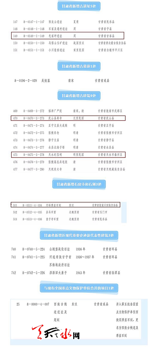 10月16日,国务院公布了第八批全国重点文物保护单位名单,其中包括新增保护单位762处,与现有全国重点文物保护单位合并的项目50处。我省与现有全国重点文物保护单位合并的项目1处,具体为西狭古栈道遗址及题刻并入第五批全国重点文物保护单位西狭颂摩崖石刻,更名为西狭古栈道及摩崖石刻。另我省新增全国重点文物保护单位21处,包括古遗址5处、古墓葬1处、古建筑9处,石窟寺和石刻3处、近现代重要史迹及代表性建筑3处。前七批我省共入选全国重点文物保护单位131处158个。