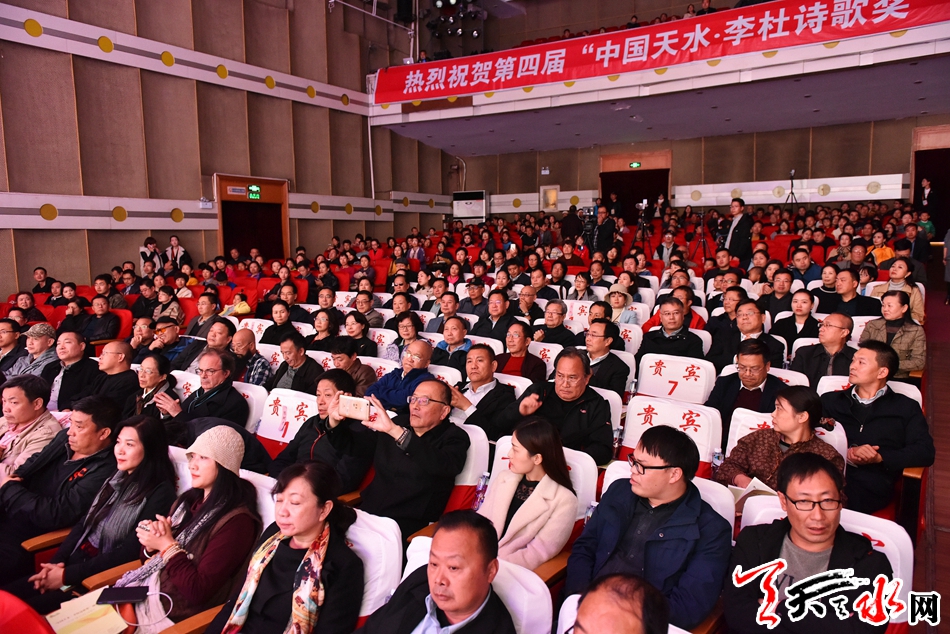 著名作家、鲁迅文学院原副院长王彬,中国作家协会诗歌创作委员会副主任、中国诗歌学会副会长、《作品》主编杨克,著名作家、书法家、文化学者肖云儒,著名诗人、中国作协《诗刊》社副主编王冰,著名当代诗歌理论家徐敬亚,甘肃省文联副主席马青山,天水市委常委、宣传部部长张建杰,市人大常委会副主任宋建平,市政协副主席屈光平,市政协副主席、麦积区委书记张智明出席颁奖典礼并为第四届“中国天水·李杜诗歌奖”成就奖、贡献奖、庆祝新中国成立70周年特别奖、创作奖、国际诗歌奖、秦风雅韵奖、新锐奖的获奖人员颁奖。著名诗人、海南大学人文传播学院教授王小妮,法国诗人伊冯·勒芒等来自国内外的诗人、作家,“感知天水历史文化 助力脱贫攻坚”采风团成员及天水各界人士200余人参加颁奖典礼。